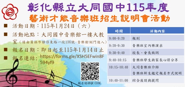 本校將於 115年1月24日(星期六)本校辦理 「大同國中115年藝術才能音樂班招生說明會活動」,懇請協助轉知貴校有 意報考的國小五、六年級學生及家長並鼓勵參加。本活動報名時間為即日起至 115年1月14日止 ,一律採google 表單進行線上報名,網址 : https://forms.gle/4xPPTLZ6Hmvh9Re5A。 |