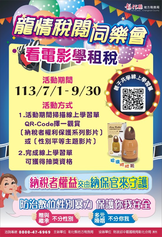 旨揭活動自即日起至113年9月30日止,只要掃描線上學習單QR-Code觀賞主題影片並完成線上學習單(https://reurl.cc/OrXgm3),即可獲得抽獎資格,獎品豐富,心動不如馬上行動。