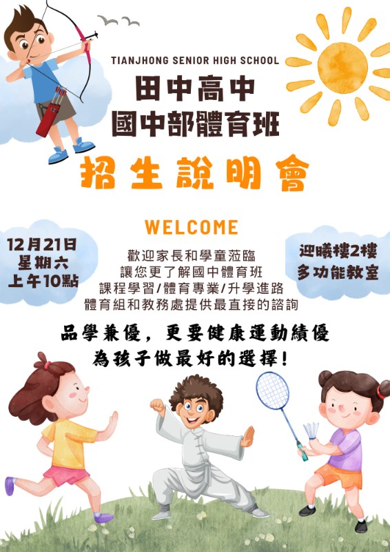 彰化縣立田中高級中學13年12月21日(六)上午10點舉辦國中部體育班「招生說明會」,歡迎學生及家長踴躍參加。 |