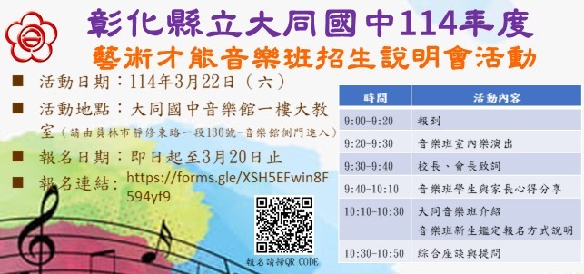 檢送大同國民中學藝術才能「音樂班」招生說明會活動文宣。 |