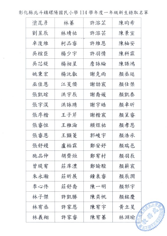 | 標題 | 螺陽國小114學年度一年級新生錄取名單 |