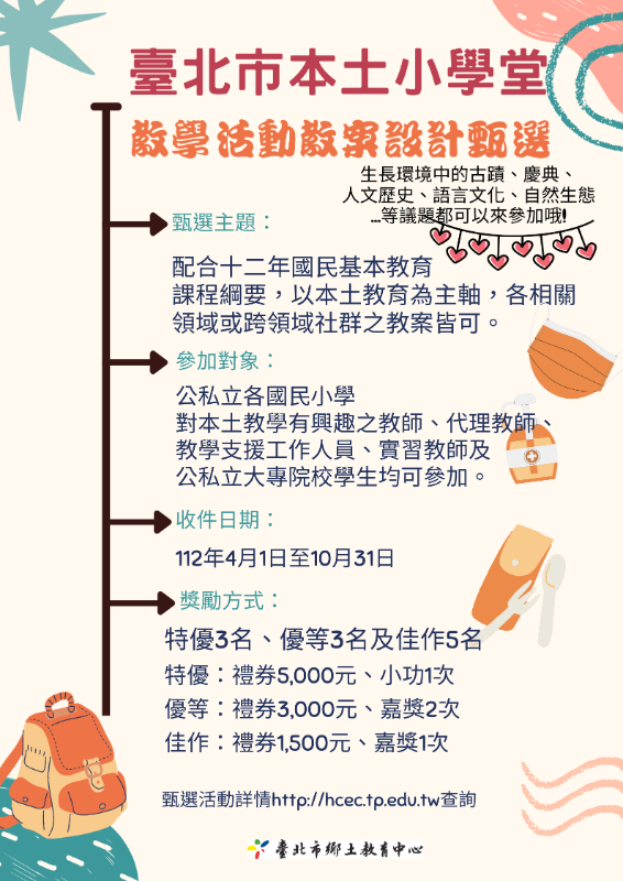 主旨: 有關臺北市鄉土教育中心辦理112年度「臺北市本土小學堂」教學活動教案甄選計畫及宣傳海報如附件,請各校教師踴躍參加,請查照。 說明: 一、 依據臺北市政府教育局112年4月10日北市教國字第1123033630號函辦理。 二、 本計畫目的為促進本土教育之課程發展,提升教師對於本土教學素材的開發及本土教育教學成效。 三、 旨揭活動辦理方式概略如下: (一) 參加對象:公私立各國民小學對本土教學有興趣之教師、代理教師、教學支援工作人員、實習教師及公私立大專院校學生均可參加。 (二) 教材主題:配合十二年國民基本教育課程綱要,以本土教學為主軸,發展各相關領域或跨領域社群之教案(以 3—6節為宜)皆可為徵選內容。 (三) 收件日期:112年10月31日(星期二)前將作品3份註明「臺北市本土小學堂—教學活動教案甄選」,掛號郵寄送達臺北市鄉土教育中心或公文聯絡箱送達(056老松國小)及電子檔傳送報名(hcec.tp@msa.hinet.net)。 (四) 獎勵方式:最高獎金每件作品禮券5,000元及每位作者特優獎狀乙幀,並依本府敍獎額度辦理敘獎。 四、 檢附「臺北市本土小學堂」教學活動教案甄選計畫、報名表、教案參考格式及宣傳海報。
