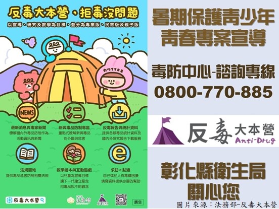 (一) 毒品成癮是腦部慢性疾病,請即早接受藥癮治療。毒防中心諮詢專線0800-770885。彰化縣衛生局關心您。 (二) 預防登革熱 清除孳生源,做好巡倒清刷 登革熱遠離我。彰化縣衛生局關心您。 (三) 正確認識ADHD注意力不足過動症 陪伴孩子與過動共處 與情緒共舞 彰化衛生局關心您。 (四) 您的心事我來守護 全人手無休免付費安心專線1925。 (五) 彰化縣關懷青少年心理健康 你我一起young起來 (六) 反毒大本營,拒毒沒問題(圖片)。 (七) 秒懂新興毒品,拒絕誘惑(圖片)。 |
