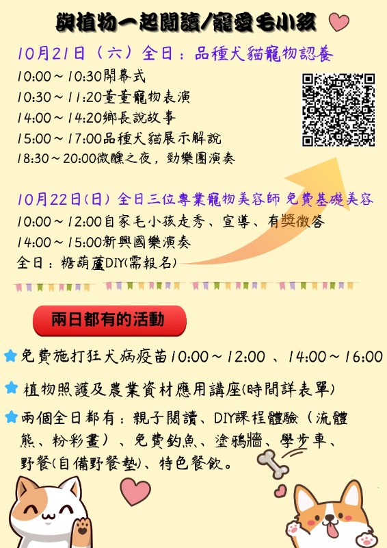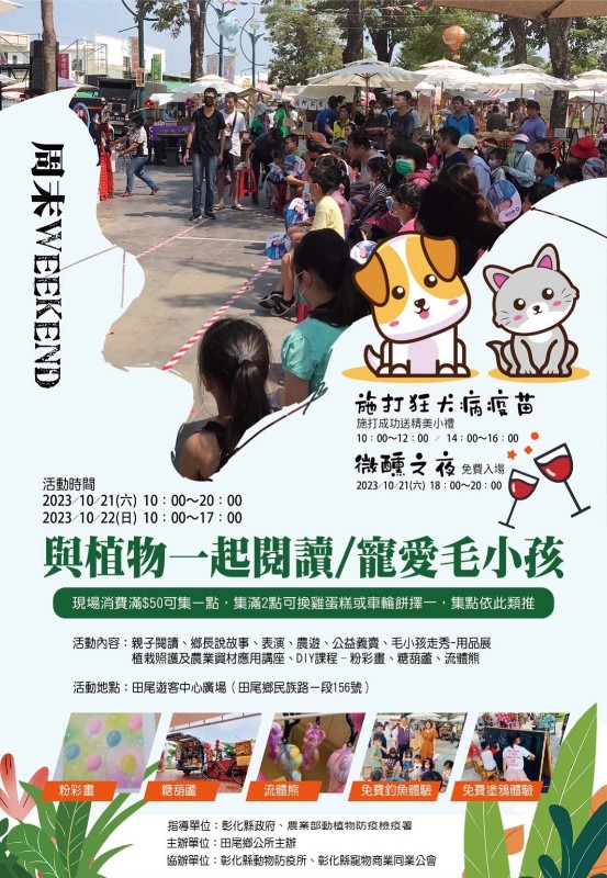 田尾本週末_ #與植物一起閱讀/#寵愛毛小孩▲日期: 10/21(六) 10:00~20:00 10/22(日) 10:00~17:00▲地點:田尾遊客中心前廣場#植栽照護及農業資材應用講座 #親子閱讀 #鄉長說故事 #農遊市集 #公益義賣 #DIY課程 (粉彩畫、糖葫蘆、流體熊)現場消費滿$50可集1點,集滿2點可兌換雞蛋糕或車輪餅乙份,集點以此類推 《寵愛毛小孩》#免費施打狂犬病疫苗 #寵物登記 ▲日期:10/21(六) 、10/22(日) 10:00~12:00/14:00~16:00▲地點:田尾遊客中心前廣場▲施打成功贈送精美小禮物,歡迎家中的毛孩們一起來