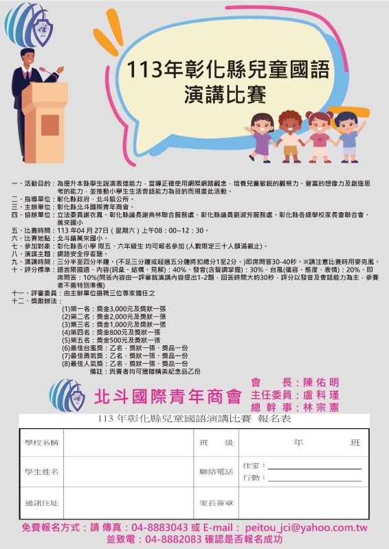 | 標題 | 轉知北斗國際青商會「113年彰化縣兒童國語演講比賽」相關資訊。 |