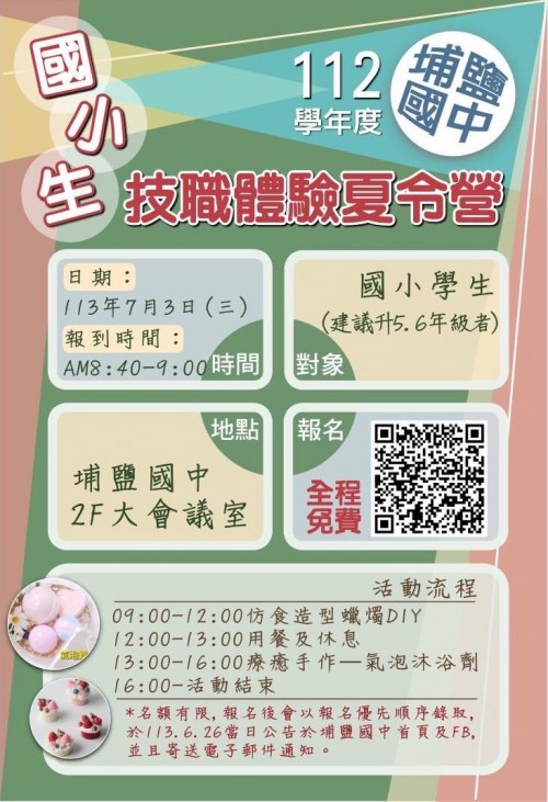 | 標題 | 轉知112學年度埔鹽國中辦理國小生技職體驗夏令營,歡迎學生踴躍參加。 |