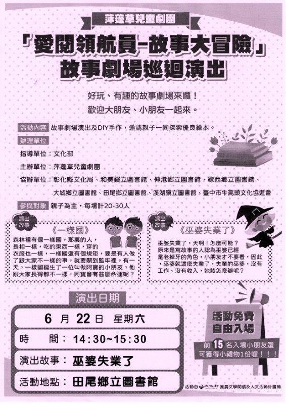 時間:6/22 星期六 下午14:30~15:30地點:田尾鄉立圖書館故事:巫婆失業了詳細內容請參閱海報附件#愛閱領航員-故事大冒險