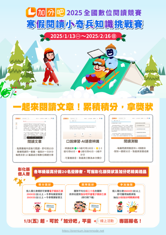 (二)對象:本縣1-6年級國小學生。 (三)報名方式:自1月3日起,可於加分吧平臺活動專區報名,分為個人賽(學生個別報名)與團體賽(老師建班報名)。 (四)平臺每週將派發 10 篇國語日報數位精選文章(含優秀學生投稿及各議題文章),共計派發 50 篇閱讀文章。 (五)將依據學生完成閱讀文章的數量、口說及閱讀測驗的分數,加總累計積分,分年級進行排名與獎勵。 四、詳細活動辦法請參閱附件計畫及海報。請轉知貴校學生踴躍報名參賽。 五、如有未盡事宜,請逕洽加分吧平臺徐小姐,聯絡電話:02-22185452 #867715。 |
