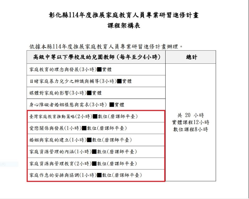 | 標題 | 本縣114年度推展家庭教育人員4小時專業研習進修課程架構表,供各位同仁參考。 |