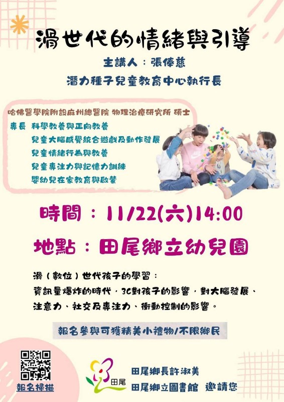 田尾鄉公所於114.11.22(六)14:00辦理「滑世代的情緒與引導」 免費講座,歡迎踴躍參加。 地點:田尾鄉立幼兒園