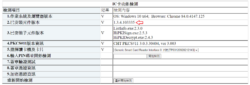 請同仁至內政部憑證管理中心下載最新版HiCOS跨平台網頁元件windows版(下載點一/ 下載點二)並執行安裝程序(解壓縮後執行HiCOS_Client.exe即可),以更新成最新版本(可點選此處確認HiCOS元件版本是否已更新為1.3.4.103335如下圖所示)