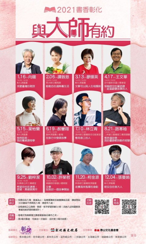 跑馬燈建議文字為:2021「書香彰化─與大師有約」專題講座,1月至12月每月辦理一場,邀請到向陽、譚敦慈、廖輝英、王文華、葉怡蘭、郝譽翔、林立青、路寒袖、劉梓潔、許榮哲、柯金源及張曼娟等知名作家演講,歡迎踴躍參加。 |