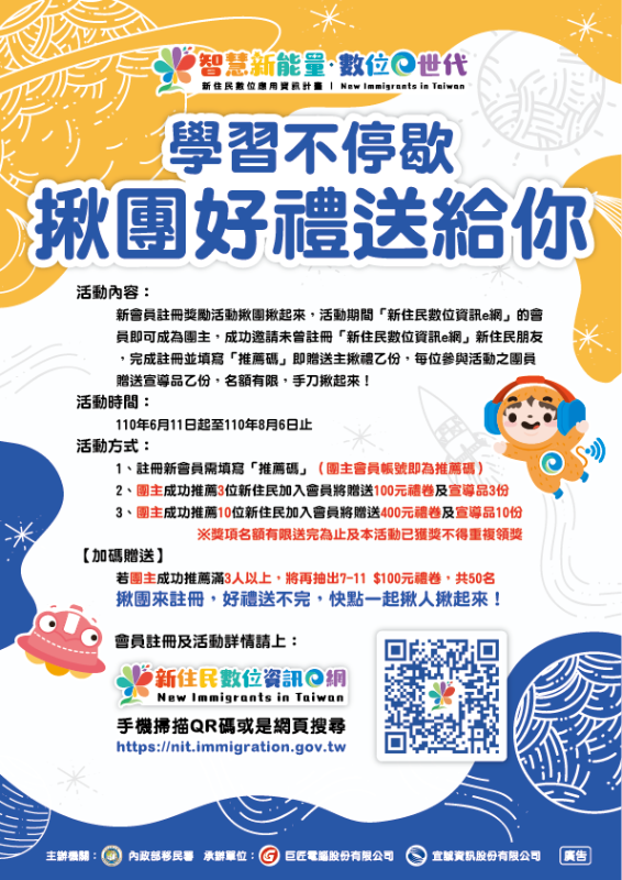 說明:一、 依據內政部移民署110年6月18日移署資字第1100064874號函辦理。二、 有關內政部移民署辦理新住民免費電腦課程,以落實新住民數位應用技能、增進親子共學,為鼓勵新住民及其子女加入會員進行線上學習,特辦理「學習不停歇、揪團好禮送給你」新會員註冊推廣活動。三、 活動期間自110年6月11日起至8月6日止,活動詳情請參閱「新住民數位資訊e網」(https://nit.immigration.gov.tw/)公布欄。四、 檢送本案「學習不停歇、揪團好禮送給你」宣傳圖電子檔,請貴校惠予公告宣傳運用,並於相關網站公布相關活動訊息及連結。