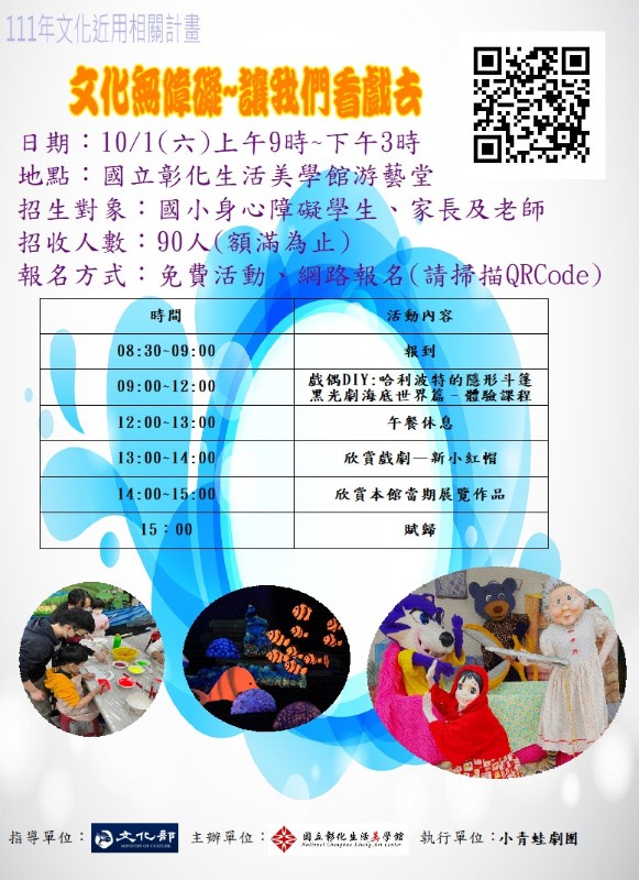 彰化生活美學館辦理「文化無障礙~讓我們看戲去」活動,符合資格師生及家長請踴躍報名參加。 說明: 活動相關計畫請參閱附件。