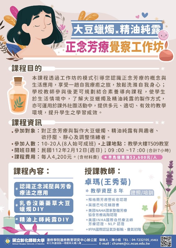 「大豆蠟燭x精油純露-正念芳療覺察工作坊」 課程時間:112年02月12日(周日)09:00-17:00,合計6小時 「生命之花-心靈粉彩藝術療癒工作坊」課程時間:112年03月12日(周日)09:00-16:00,合計6小時