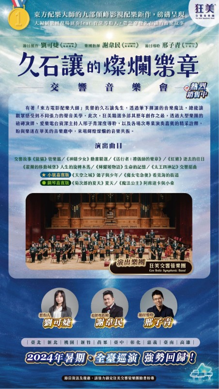 狂美交響管樂團為鼓勵民眾入場欣賞藝文展演活動、體驗音樂文化之美,檢送「《久石讓的燦爛樂章》交響音樂會」電子文宣(EDM)。 說明: 一、節目介紹:久石讓先生,身兼作曲家、指揮家、鋼琴家,及「吉卜力工作室」音樂總監的多重身分,透過筆下揮灑的音樂魔法,他總能在每部影像作品中,讓觀眾感受到不同張力的聲音美學,本節目中狂美精選多部久石讓先生歷年創作之最,盼與樂迷朋友在華美的音樂廳中,來場輝煌燦爛的音樂共振。 二、演出時間及地點: (一) 臺北-國家音樂廳 07/21(日) (二) 臺北-臺北市中山堂中正廳 07/12(五)-07/14(日) (三) 新北-臺藝表演廳 07/27(六)、07/28(日) (四) 桃園-桃園展演中心展演廳 08/02(五)、08/03(六) (五) 竹市-新竹市文化局演藝廳 08/16(五)、08/17(六) (六) 苗栗-苗北藝文中心演藝廳 07/07(日) (七) 臺中-臺中國家歌劇院大劇院 07/05(六)、07/06(日)、08/07(三)、08/08(四) (八) 彰化-彰化縣文化局員林演藝廳 08/23(五)、08/24(六) (九) 嘉市-嘉義市政府文化局音樂廳 09/22(日) (十) 嘉縣-嘉義縣表演藝術中心演藝廳 09/21(六) (十一)臺南-臺南文化中心演藝廳 08/09(五) (十二)高雄-衛武營國家音樂廳 08/10(六)、08/11(日)、08/28(三)、08/29(四)