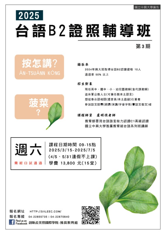 一、 課程特色 (一) 台語認證系列,以通過教育部閩南語認證考試B2中高級為目的,從閩南語語言學基礎,循序漸進規劃閩南語(臺語文) 學習,操練閩南語聽、說、讀、寫能力。課程從明年4月到7月開講,運用學習單讀音演練,透過讀音用字糾正,協助學習者發現盲點,建立符合教育部閩南語用字正確觀念。 (二) 課程由取得教育部閩南語語言能力認證C1專業級盧明德老師授課,歡迎國高中、小、幼兒園教師(含代課教師),欲報考本土語言師資教甄者加入。 二 課程日期如下: 台語B2證照輔導班第3期,2025/3/15-2025/7/5,每週六9-15點(4/5清明、5/31端午連假不排課),共15次,優惠價13,800元(不含教材與午餐)。 地點:國立中興大學綜合大樓13樓1304室(暫定)。
