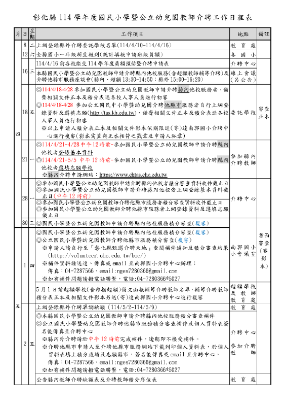 說明: 一、依據本縣114學年度國民小學暨公立幼兒園教師甄選介聘委員會第1次會議決議辦理。 二、本縣114年公立國民小學暨幼兒園教師介聘他縣市服務作業主要時間如下: (一)申請縣外介聘教師應於114年4月28日前上網填報資料(網址https://tas.kh.edu.tw)。 (二)本年度縣外介聘積分審查作業採書面審查方式辦理,申請人請備齊相關文件正本及積分表供各校人事人員進行初審,積分表正本及相關文件影本(影本需蓋與正本相符之戳章及申請人之私章)於114年4月28日前寄(親)送達南郭國小介聘中心(彰化市中興路98號)。 (三)114年5月1日積分審查小組進行積分複審,申請人請自行查閱線上補件通知及積分審查結果(http://volunteer.chc.edu.tw/boe/),如需補件,請於114年5月2日中午12時前完成。 (四)申請人至教師介聘他縣市服務網站下載個人資料表,於個人資料表空白處寫上積分成績及志願縣市,並簽名後於114年5月2日傳真或電子郵件至介聘中心,傳真:047287566、Email:nges7280366@gmail.com。 三、另請利用洽公之便至南郭國小警衛室(彰化市南校街19號)領取「114年公立國民中小學暨幼兒園教師介聘他縣市服務作業申請表」。 四、請詳閱114年公立國民中小學暨幼兒園教師介聘他縣市服務作業要點,如有補充或修訂,請隨時留意本府新雲端公告及本縣介聘天地相關訊息,並依公告之作業要點規定辦理。