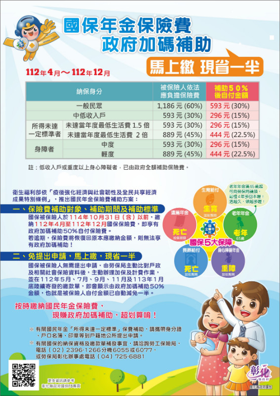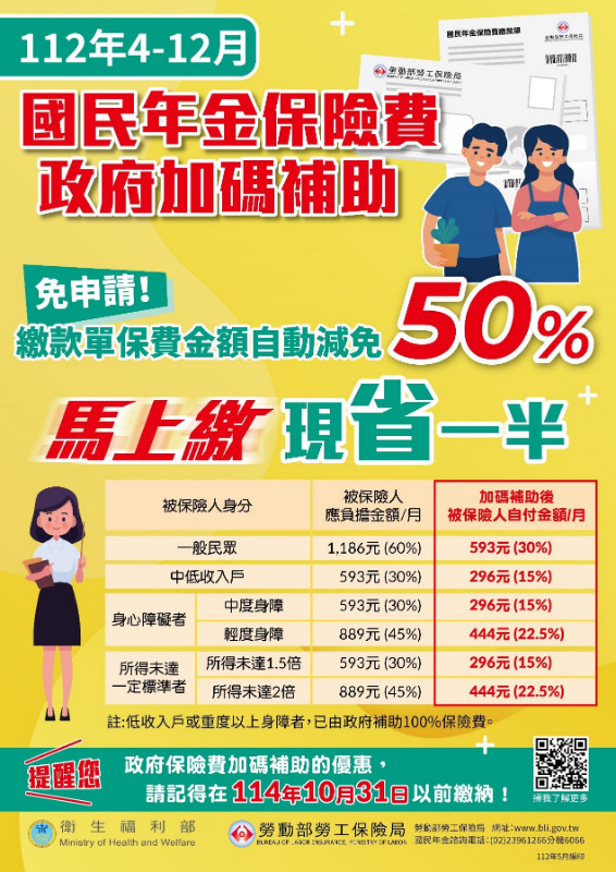 - 衛生福利部為加強照顧國民年金被保險人,業於112年4月14日函頒「衛生福利部因應疫後補助國民年金保險費辦法」。被保險人於114年10月31日(含)以前,繳納112年4月至112年12月保險費,即享有政府加碼補助50%自付保險費。被保險人無需提出申請,由勞工保險局主動辦理加保及計費作業,並在今(112)年5月、7月、9月、11月及明(113)年1月底陸續寄發的繳款單,即會顯示由政府加碼補助50%金額,被保險人自付金額已自動減免一半,以一般被保險人為例,一般身分被保險人每月原應負擔60%保險費1,186元,保費減半只須負擔593元,可減輕保險費負擔。