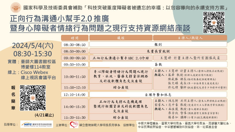 轉知臺師大辦理「正向行為溝通小幫手2.0 推廣暨身心障礙者情緒行為問題之現行支持資源網絡座談」資訊(實體+線上),鼓勵相關人員踴躍報名 |