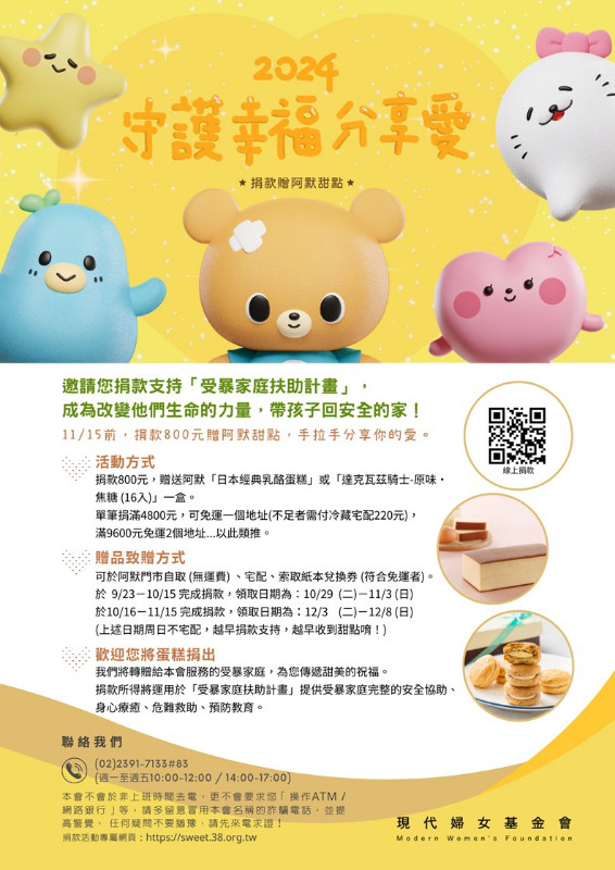 - 歡迎透過該會「2024守護幸福分享愛」活動網頁線上捐款https://sweet.38.org.tw,或傳真回覆紙本捐款單捐款(詳見附件一)。