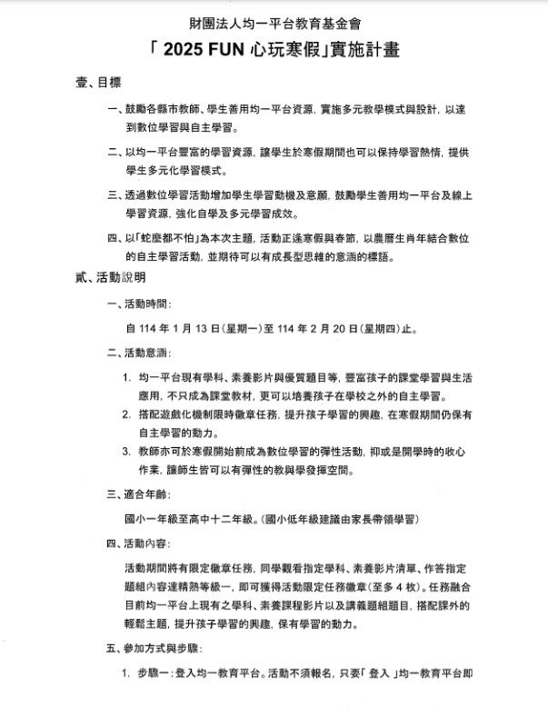 說明: 一、依據財團法人均一平台教育基金會113年12月17日均一平台教育基金會字第113000903號函辦理。 二、活動資訊: (一)活動時間:114年1月13日(星期一)起至2月20日(星期四)止。 (二)活動對象:高級中等教育以下學生。 (三)活動方式:活動期間登入均一平台完成學習任務,可得活動限定徽章。詳細活動內容已於均一平台公告, 有興趣師生請至平台了解詳情。