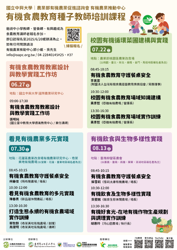 說明: 一、 依據國立中興大學114年5月9日興農字第1141700974號函辦理。 二、 為強化食農教育師資之有機農業相關認知與實作教學,及提升有機食農教育師資之專業性,國立中興大學有機農業推動中心辦理「有機食農教育種子教師培訓課程」,敬邀中小學教師、營養師、有興趣成為有機食農教育師資者報名。惠請公告課程相關訊息,並轉知相關人員報名參加。 三、 旨揭辦理資訊說明如下: (一) 開課時間、課程名稱及課程地點 1、 114年6月27日(星期五)09:00-18:00,有機食農教育教案設計與教學實踐工作坊:「有機X食農-打造有機食農教育關鍵字」、「有機食農教育教案設計與實踐案例分析」、「有機食農教育教案策略分析與應用實踐」,課程地點:國立中興大學國際農業研究中心。 2、 114年7月22日(星期二)08:45-17:00,「有機食農教育守護餐桌安全」、「校園有機食農教育場域知識建構」、「校園有機食農教育場域實作訓練」,課程地點:農業部桃園區農業改良場。 3、 114年7月30日(星期三)08:45-17:00,「有機食農教育守護餐桌安全」、「看見有機食農教育的多元實踐」、「打造生態永續的有機食農場域實作訓練」,課程地點:花蓮區農業改良場有機農業研究中心 、奇萊美地有機農場。 4、 114年8月13日(星期三)08:45-17:00,「有機食農教育守護餐桌安全」、「有機飲食及生物多樣性實踐」、「有機好食光-在地有機作物生產規劃與調理實作訓練」,課程地點:臺南市柳營區農會。 (二) 課程對象:中小學教師、營養師、有興趣成為有機食農教育師資者。 (三) 報名方式及截止日期:採網路報名,相關辦法請詳見有機農業推動中心網站「服務項目–最新活動–中心有機活動」專區填寫報名表:https://www.oapc.org.tw/2025-organic-agrifood-education/,報名截止日期為114年6月20日或額滿截止。 (四) 課程費用:免費,實體課程報名成功後需繳納保證金500元,全程參與課程者將全額退費。