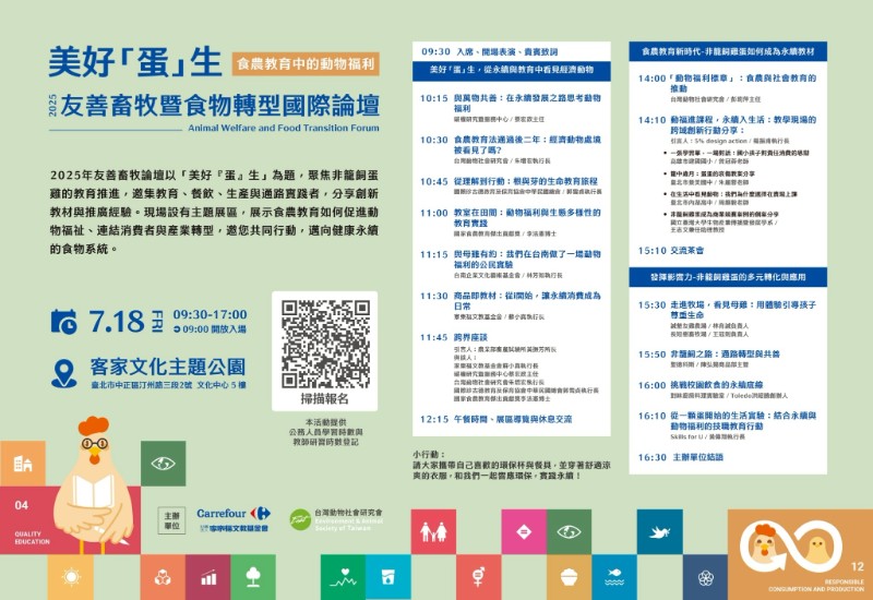 說明: 一、 依據國立中山大學114年7月10日中校友字第1146700092號函辦理。 二、 旨揭論壇以「食農教育中的經濟動物福利推廣」為核心主題,邀請來自教育、餐飲、生產、通路等不同領域的實踐者,共同分享其在校園、餐廳、社區與牧場推動動物福利教育的創新教材與經驗,深入探討食農教育如何成為連結消費者與生產者、促進產業轉型的力量。 三、 旨揭論壇設有【美好「蛋」生】食農教育主題展區,展示各式創意教材與行動案例,誠摯邀請所有關心永續教育、動物福祉與食物轉型的夥伴共同參與。 四、 活動資訊如下: (一) 活動時間:114年7月18日(星期五)9時30分至17時。 (二) 活動地點:客家文化主題公園-文化中心5樓(臺北市中正區汀州路三段2號)。 (三) 主辦單位:財團法人家樂福文教基金會、社團法人台灣動物社會研究會、國立中山大學。 (四) 參加對象:名額約150人,歡迎媒體、主管機關代表、學術與教育界人士、友善畜牧與餐飲食品業者、永續與食農推廣者、品管及行銷人員、關心本議題的家長和地方工作者踴躍參加;主題展區開放自由參觀。 (五) 報名網址:https://forms.gle/LFe2zo5XgU9MS2Qr7。 (六) 本活動提供登記6小時公務人員學習時數及教師研習時數,請有需求者於報名表單中勾選相關選項並填寫相關資料,以利後續作業。