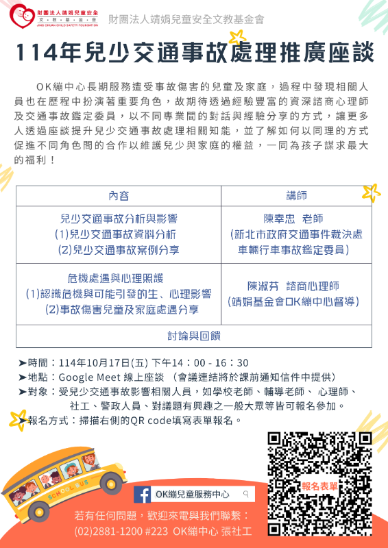 說明: 一、 依據財團法人靖娟兒童安全文教基金會114年8月29日114靖娟北總字第1140000357號函辦理。二、 該會辦理兒少交通事故處理推廣座談,期待透過對話方式從交通、心理、社會等角度分享該中心協助處理交通事故的服務經驗傳達給更多相關工作者,讓不同專業之間以同理的態度更了解彼此,一同協助為孩子謀取最大的利益。三、 檢附「114年兒少交通事故處理推廣座談」宣傳單張1份。