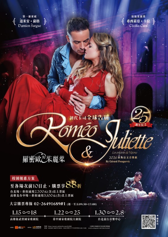 說明: 一、 經典法文音樂劇《羅密歐與茱麗葉》自2001年在巴黎首演即轟動全球,以磅礴動人的音樂、現代感十足的編舞與都市巴洛克風格美學,重新詮釋莎士比亞經典悲劇,劇中更以紅與藍兩大色系象徵家族對峙,展現強烈視覺張力;而初代卡司的演出早已成為大眾心中難以取代的記憶,本次適逢音樂劇25周年同時也是初代卡司告別巡演,讓這次在台灣的演出更具紀念性。法文音樂劇以獨樹一格的「演唱會」形式製作打造,特別強調「音樂」與「演員魅力」,以「歌」帶「戲」是法式音樂劇製作的順序與模式,藉由歌曲詠唱以及雋永詞彙的表達,再加上多樣化背景音樂襯托,讓演員的情緒起伏及情感傳遞更加深刻。誠摯推薦師生前來觀賞國際級精彩演出,並藉此增進對各類表演類型的了解。 二、 表演場次: (一) 高雄衛武營國家藝術文化中心 歌劇院 1、 2026年1月15日(四)19:30 2、 2026年1月16日(五)19:30 3、 2026年1月17日(六)14:30、19:30 4、 2026年1月18日(日)14:30 (二) 台中國家歌劇院 大劇院 1、 2026年1月22日(四)19:30 2、 2026年1月23日(五)19:30 3、 2026年1月24日(六)14:30、19:30 4、 2026年1月25日(日)14:30、19:30 (三) 台北流行音樂中心 表演廳 1、 2026年1月30日(五)19:30 2、 026年1月31日(六)14:30、19:30 3、 2026年2月 1 日(日)14:30 4、 2026年2月 4 日(三)19:30 5、 2026年2月 5 日(四)19:30 6、 2026年2月 6 日(五)19:30 7、 2026年2月 7 日(六)14:30、19:30 8、 2026年2月 8 日(日)14:30 三、 演出亮點: (一) 法國音樂史上製作規模最盛大,被譽為「21世紀最偉大的流行音樂劇」 (二) 25週年初代卡司全球告別巡迴,亞洲巡演最終站 (三) 2001年首演後轟動全球,吸引超過650萬戲迷觀賞 四、 購票優惠方案及票價: (一) 校園團體優惠方案:至各場次開演前10天,購票享88折。 1、 台北場:折扣適用2,700元(含)以上票區 2、 高雄及台中場:折扣適用3,100元(含)以上票區 (二) 專屬訂購連結:https://pse.is/89ga3w 五、 敬請惠予公告本表演相關訊息於貴單位。 六、 檢送本活動EDM,呈請貴校員工、師生及家長踴躍參加。 七、 本案聯絡單位: 八、 通路行銷中心服務專線:(02)2649-1689#1。傳真:(02)8643-3548。