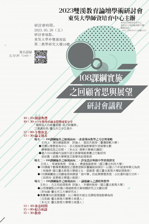 一、依據東吳大學112年5月17日東師培字第1122400634號函辦理。 二、本次研討會以「108課綱實施之回顧省思與展望」為主題,邀請國內學者專家發表論文外,亦邀請臺北市立中正高中江惠真校長(榮獲111年教學卓越金質獎)分享寶貴課程設計與教學經驗。 三、研討會相關活動訊息如下: (一)時間:112年5月26日(五)上午10時20分至下午3時30分。 (二)地點:東吳大學雙溪校區第二教學研究大樓10樓人文社會學院會議室、D1005研討室、D1011研討室。 (三)報名日期與方式:自即日起至5月19日下午5時為止;請至報名網址(https://forms.gle/oJEsVotemyPgJaes8)報名,或掃描海報上報名QR Code。 四、若有相關疑問請洽本案承辦人,楊宇謙(02)2881-9471分機6123。