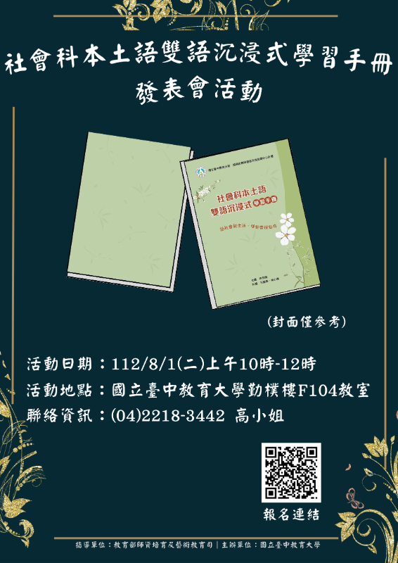 | 標題 | 轉知:有關國立臺中教育大學辦理「社會科本土語沉浸式雙語學習手冊發表會 活動」,請各校轉知所屬教師踴躍報名參加 |