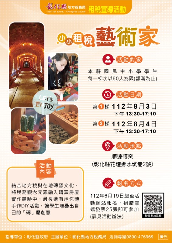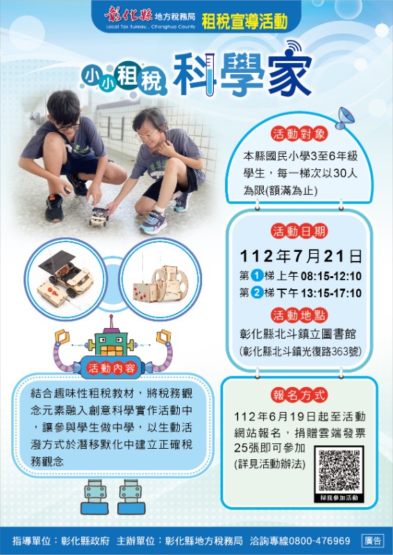 說明:一、旨揭活動說明如下:(一)「小小租稅科學家」活動日期為112年7月21日,於北斗鎮立圖書館辦理。(二)「小小租稅表演家」活動日期為112年7月26日,於本局員林分局3樓禮堂辦理。(三)「小小租稅藝術家」活動日期為112年8月3日及4日,於花壇鄉順達磚窯辦理。二、報名方式:自112年6月19日起至7月5日止至活動網站報名,捐贈雲端發票25張即可參加。三、相關活動詳情請參閱本局官網活動訊息或粉絲團查詢,或撥本局免費服務電話0800-476969洽詢。