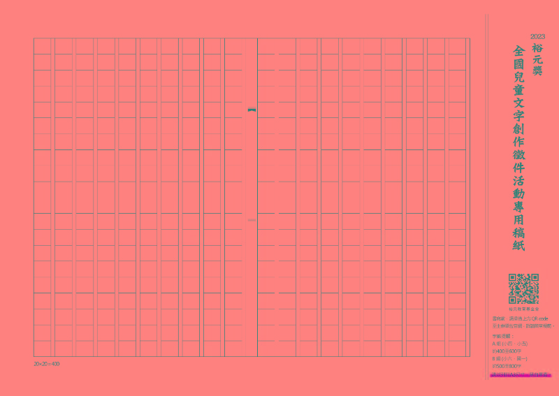 限作者親筆書寫之手寫稿件,且以黑色或藍色原子筆書寫於400格之稿紙。(可自行準備稿紙,或至活動網頁下載活動稿紙。) |
