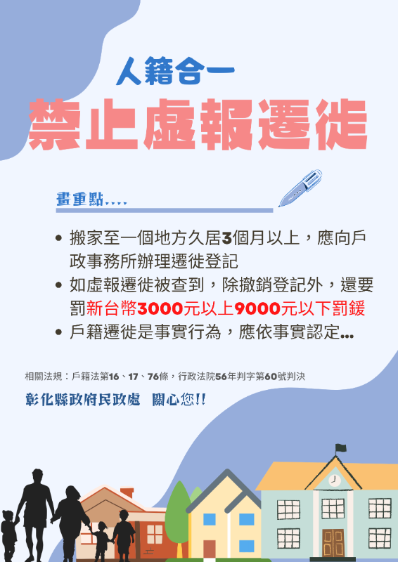 有關遷徙登記應依居住事實審認,以符合「人籍合一」原則, 並正確戶籍資料,敬請貴單位協助公告張貼海報及跑馬燈或電視牆宣傳,至紉公誼。 |