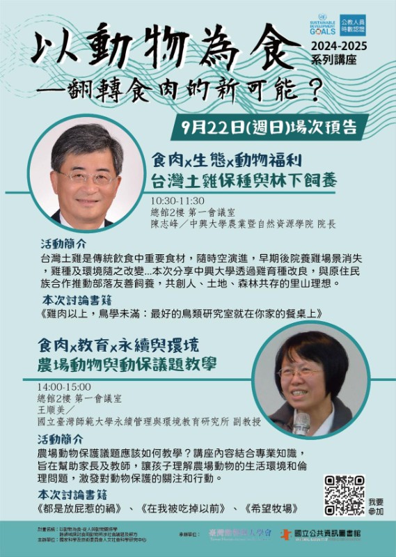 旨揭活動由國立公共資訊圖書館與「臺灣動物與人學會」合辦,自113年8月起至114年6月止,就「以動物為食」主題邀請相關領域專家與教育者,與讀者共同參與、討論、激盪多元火花,為自己、家人及大眾未來可能遭遇的生活問題預想因應;系列講座主題包括SDGs、食農、科普等相關內容,採實體講座及線上同步直播方式進行,並搭配線上及實體書展,每場介紹1-3本書籍。 |