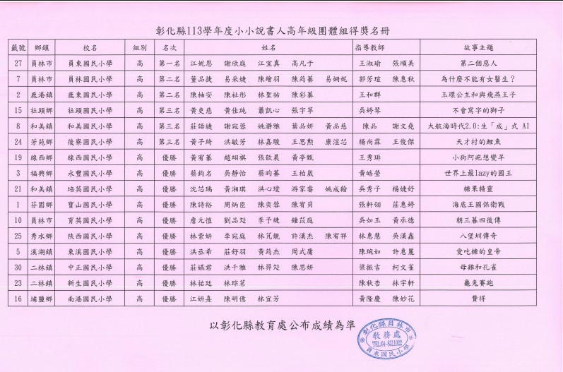 | 標題 | 賀!本校學生參加彰化縣113學年度小小說書人比賽榮獲高年級團體組優勝 |