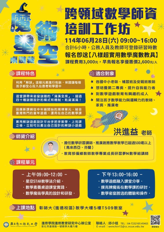如有相關問題,請向本校進修學院進修教育研究中心洽詢 : 04-7232105 分 機 5463 邱 小 姐 , E-mail :wenchin12@cc.ncue.edu.tw。