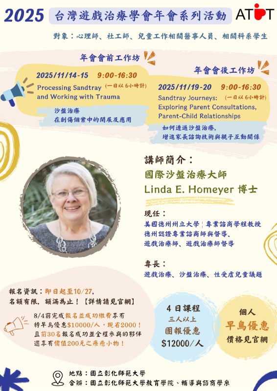 台灣遊戲治療學會與國立彰化師範大學教育學院、輔導與諮商學系,將於114年11月14、15日;11月19、20日共同舉辦【台灣遊戲治療學會年會系列活動】沙盤治療在創傷個案中的開展及應用;如何透過沙盤治療增進家長諮詢技術與親子互動關係,詳情如說明及附件,請有興趣的老師及家長參加。 |