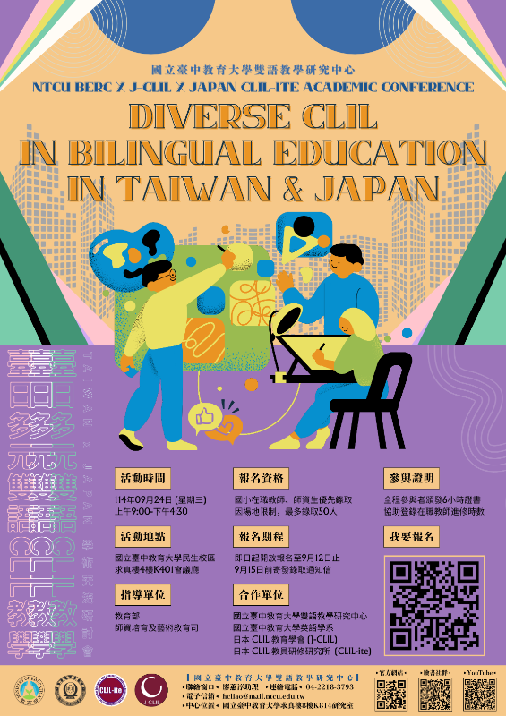 一、依據國立臺中教育大學雙語教學研究中心114年8月8日臺中大學英語字第1143060716號。 二、旨揭活動為促進多元雙語教學之經驗交流與專業成長,謹訂於114年9月24日(星期三)上午9時至下午4時30分於國立臺中教育大學民生校區求真樓4樓K401會議廳辦理,請貴校轉知並鼓勵教師踴躍參加,參與教師將提供6小時研習時數並登錄於全國教師在職進修資訊網。 三、報名連結:https://forms.gle/hgJ3EBZU3hYvpJnG7填寫報名表單。 四、檢附研討會宣傳海報,詳如附件。