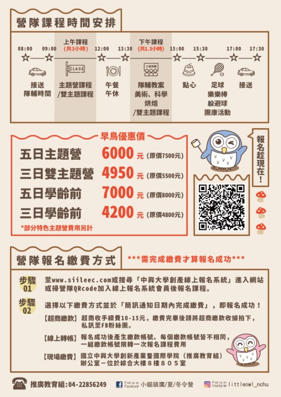2024年冬令營日期,五日主題營共兩週 1/22-1/26及1/29-2/2;三日雙主題營 2/5-2/7,總共13天的冬令營。報名方式至線上報名系統www.siileec.com。FB請搜尋:NCHUSMARTOWL;IG請搜尋:littleowl_nchu |