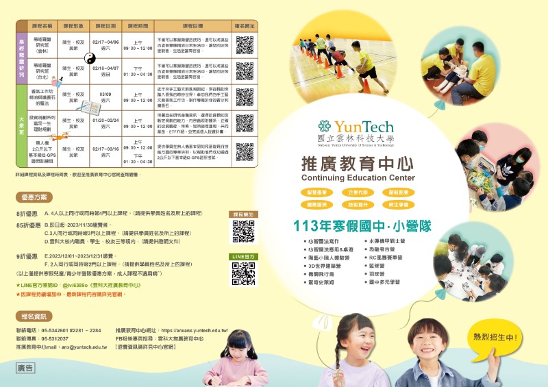 | 標題 | 轉發雲林科技大學推廣教育中心於寒假期間舉辦國中及國小冬令營培訓,歡迎踴躍報名。 |
