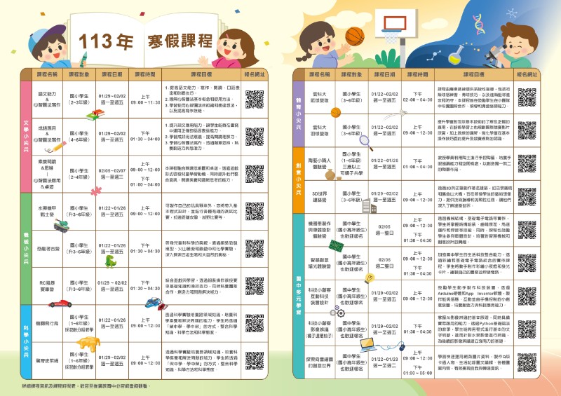 一、本校冬令營課程涵蓋機械創客、科技與創意設計、體育運動、藝術創意發想、科學實驗、素養閱讀思考與文學創作等多元主題,旨在提供學生全方位的知識與技能培訓,讓他們在假期中持續精進學習。