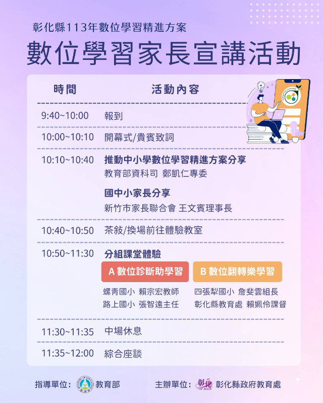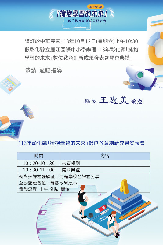縣府訂於10/12(六)上午9時起在鹿江國際中小學辦理本縣數位教育創新成果發表會, 除靜態課程展示外,亦設置5G/VR頭盔體驗區、動態互動體驗區及亮點教師教學分享, 由本縣教師分享如何結合AI、數位進行教學,邀請教師、家長們踴躍參加,一起體驗數位教學魅力。