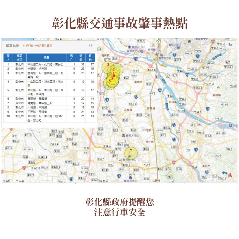 根據交通部道安資訊查詢網統計快覽數據跟去年同期比較分析,以高齡者事故無照駕駛增加最多,少年自行車騎士(含電自、電輔)次之。本縣8月份30日死亡人數於「彰化市、福興鄉、鹿港鎮」為多,8月肇事熱點以「彰化市」為多,合先敘明。 |
