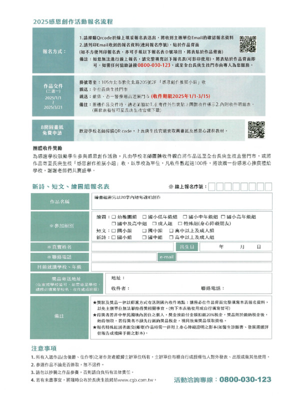 2025年度感恩創作活動辦法 長庚生技感恩創作活動,已經邁入第19年,陪著無數的小朋友一起成長,心中的感恩小幼苗已經長成大樹。 豐富的色彩、誠摯的話語、動人的影像,化成一件件表達感謝的創作,溫暖著你我的心。 邀請您和我們一起,把感恩的心用圖、用文字、用影像表達出來詳情請洽全台長庚生技門市。 ◇ 參加方式 ◇ ►創作主題 ►收件時間 ► 收件方式 ► 得奬公佈