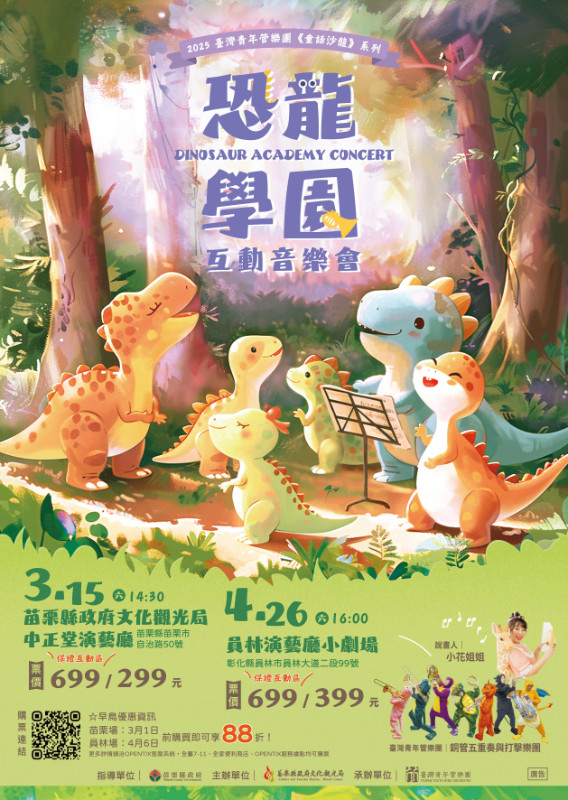 節目介紹:2025年臺青管童話沙龍【恐龍學園】互動音樂會即將帶給各位最好玩最好聽的音樂會,邀請大小朋友與臺上恐龍樂手們同樂,由親和力一級棒的小花姐姐–游雅芸帶領進入恐龍學園的奇幻世界,透過戲劇化的聲音表情、生動活潑的互動,帶來許多精彩互動遊戲,一同展開一場充滿歡笑與互動的音樂冒險之旅。今年全新推出「音樂會保證互動區」特別設計的互動橋段,讓寶貝全程參與,享受更多趣味與驚喜!讓親子時光更難忘,帶來滿滿笑聲與感動!節目中將透過互動遊戲,引導大小朋友認識各種銅管和打擊樂器,展示每個樂器的獨特性和表現力,激發對音樂的興趣和探索,期待都能在快樂中學習,共同探索音樂的奇妙世界。 |