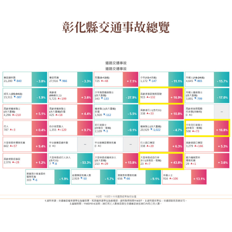 根據交通部道安資訊查詢網統計快覽數據跟去年同期比較分析,以大型車造成自行車涉入增加最多,高齡者事故無照駕駛次之。1至11月份30日死亡人數於「彰化市、福興鄉、鹿港鎮、員林市」為多,肇事熱點以「彰化市」為多,合先敘明。
