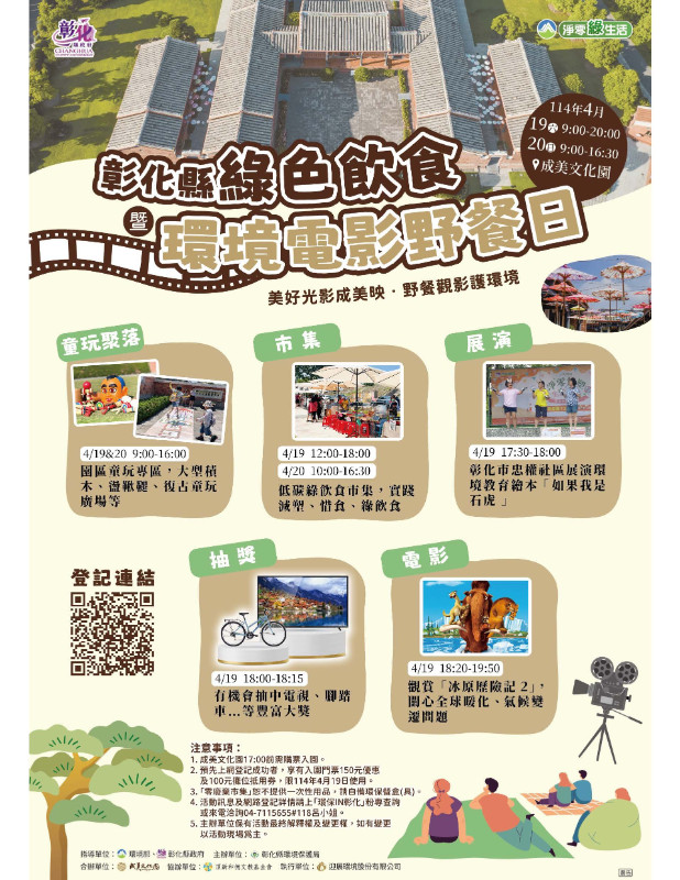 轉知:彰化縣環境保護局 於114年4月19日於成美文化園辦理「綠色飲食暨環境電影野餐日」活動 |