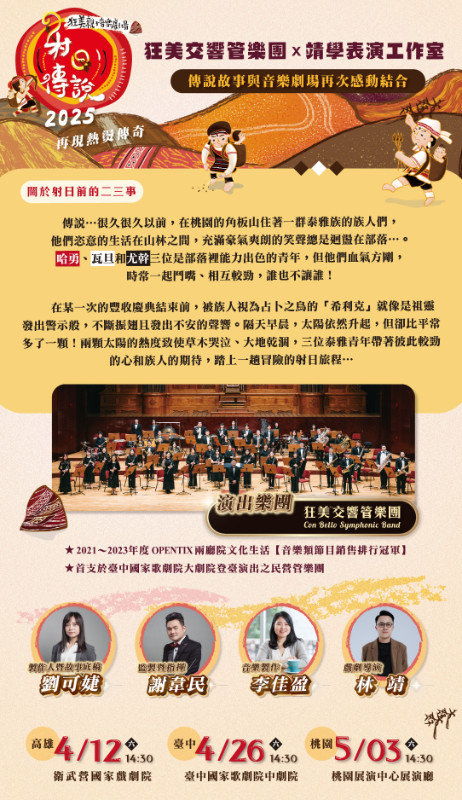 節目介紹:泰雅族為臺灣第三大的原住民族群,狂美挑戰其古老神話「射日」之傳說。透過知名作曲家-李佳盈的量身譜曲,與戲劇、雜技的精彩結合。演繹充滿泰雅古調的樂音,真實寫意每個山水意象,讓您在音符中聽見原民的脈動與情感!傳說故事與音樂劇場感動結合,是您絕對不容錯過的音樂劇場作品!捎上您的想像,跟著狂美的腳步,帶您壯、遊、原、鄉。 |